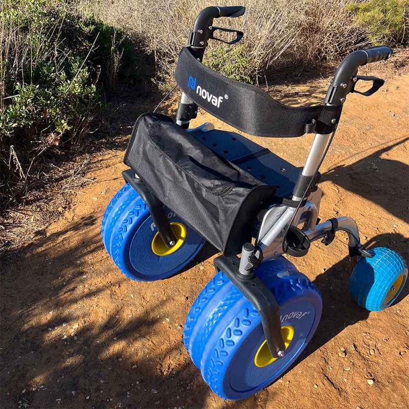 Le Rollator City Beach est un déambulateur tout-terrain conçu pour la plage, les chemins de campagne et les surfaces irrégulières.