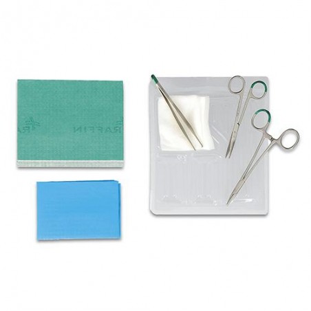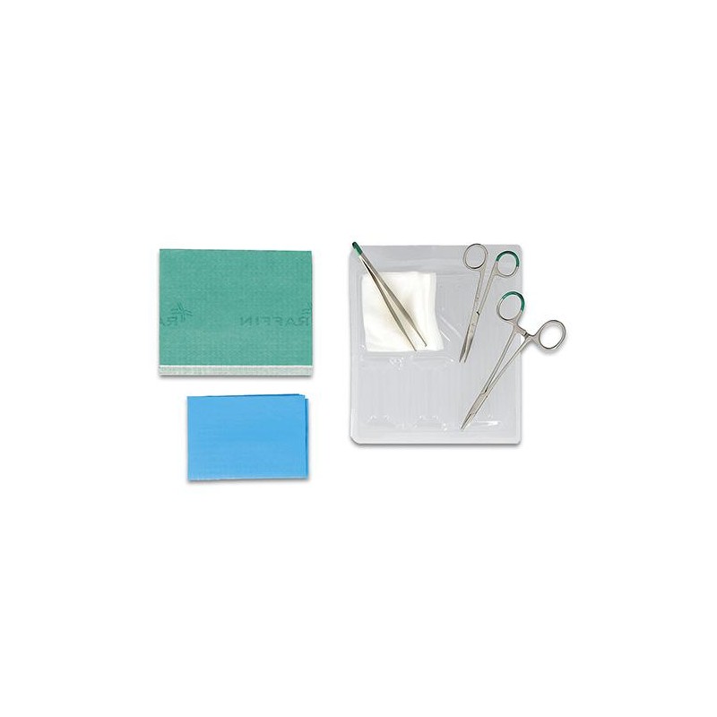 Descriptif du produit : Usage unique, stérile 1 champ 32 x 48 cm en cellulose/PE 5 compresses, en non tissé 7,5 x 7,5 cm, 4 plis, 30 g 1 pince adson en inox 12 cm à griffes 1 paire de ciseaux pointus en inox avec boucles en plastique 12 cm 1 pince porte-aiguille en inox 14 cm 1 blister, 4 alvéoles 15 x 20 cm